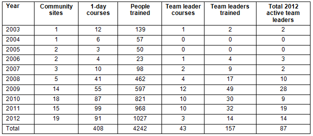 Since its inception in 2003, the CORES program has been adopted by Tasmanian communities and by rural communities in three other Australian states. CORES has delivered 408 of the 1-day SAIP courses to 4242 individuals, with 43 TLTP programs for 157 team leaders of whom 87 remain active in their community (Table 3). The focus of the first 5 years was to refine the program, while the last 5 years have seen a significant expansion into other rural communities concerned about mental health and suicide rates (Table 4).
