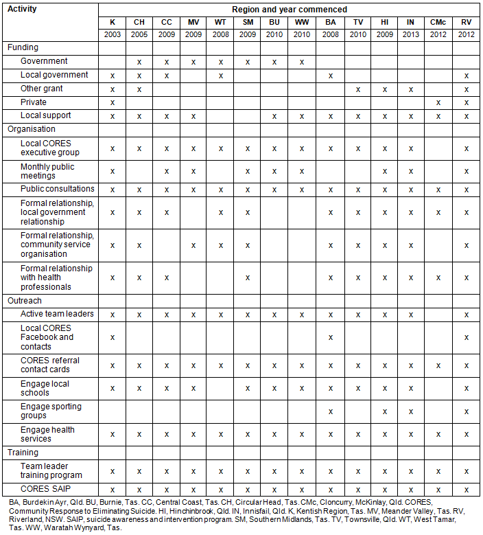 The unique element of the CORES program, compared to models used by Lifeline and Beyondblue, is the focus on community engagement. CORES aims to strengthen communities through its network of activities that link individuals and groups across service organisations, schools and sporting teams. CORES promotes inter-community networking across the country and amongst training teams so that communities can learn and support each other. This growing community strength frees capacity within CORES so that it can continue work with new communities. CORES has been specifically engaged in some communities after drought or natural disasters because of its focus on community engagement and leadership rather than service delivery. The presence of active community leaders and active community organisations is the key to CORES' ability to work with communities. Not all communities are able to engage and sustain CORES, and attempts to build CORES within 12 other communities have stalled or failed. In several communities suffering a combination of drought, industry restructuring or downturn, business closures and increasing unemployment, service organisations and key community leaders have been overwhelmed and unable to take on further work to sustain leadership or funding to embed CORES.