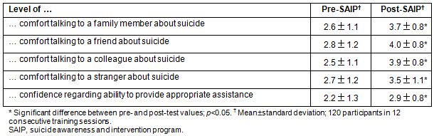 Participant experiences with the SAIP have been positive. The scaffolding of understanding of a suicide journey by the river analogy and funnel vision exercise consistently received strong positive feedback and participants reported grasping concepts more fully through the reiteration of these strategies. The use of a team teaching approach was introduced after some participants needed 'time out' after disclosure of emotional events related to suicide experiences. The approach enables one trainer to step out and support any individual who may have an emotional response to the training, thus maintaining a supportive and safe environment. The funnel vision experience was very challenging for some participants, although the majority reported that the exercise provided them with a sense of how individuals contemplating suicide may view their world. Analysis of the SAIP surveys revealed a greater awareness of the signs and symptoms of an individual at risk, which resulted in a positive shift in attitude towards those individuals and improved knowledge and practical skills. Participants also reported higher levels of comfort and confidence (Table 5) in discussing suicide with those who may be considering it.