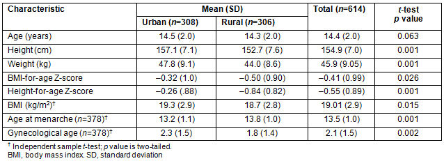 The majority (61.6%; n=378)) of the girls were post-menarche. Of these, 66.9% (n=206) were from the urban and 56.2% (n=172) were from the rural groups. The mean age at menarche for menstruating girls (n=378) was 13.5±1.0 years, with the urban girls reaching menarche at an earlier age than their rural counterparts (13.2±1.1 urban vs 13.8±1.0 rural; p=0.001) (Table 1).