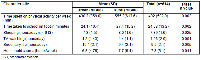 The various physical activities of the two groups of girls are summarized in Table 2. The majority (79.3, n=487)) of total participants engaged in at least 40 minutes of physical activity per day in five or more days during the week preceding the interview. More household chores were performed in rural settings. Eighty-eight percent (n=268) of the urban group walked to school, compared to 93.5% (n=283) of the rural group (χ2=5.5, p=0.02). A minority of the urban and rural girls, 15% (n=46) and 18% (n=55), respectively, were engaged in paid work after school.