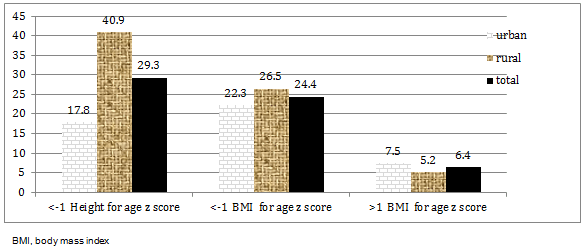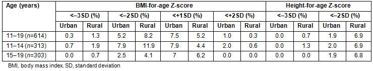 The data were analyzed using the Statistical Package for the Social Sciences v16 (SPSS Inc., http://www.spss.com). Height-for-age Z-scores (HAZ) and body mass index (BMI)-for-age Z-scores (BAZ) were calculated using the WHO growth reference data for adolescents (AnthroPlus v1.0.3; http://www.who.int/growthref/tools/en). The prevalences of stunting and the underweight category were calculated from the mean HAZ and BAZ, respectively, using the cutoff point <-2 standard deviations (SD). Overweight was considered as BAZ >+1SD22. The mean HAZ, BAZ, age at menarche, and gynecological age (age since menarche) was also calculated. The urban-rural disparity in nutritional status was tested using the Pearson χ2 test for categorical data (stunting and BMI categories) and the independent student t-test for continuous (mean HAZ, BAZ, and age at menarche) data.
