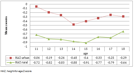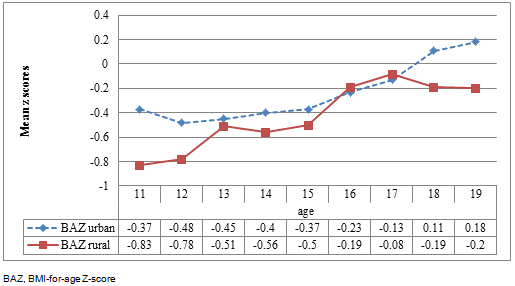 The age, height, weight, BAZ, and HAZ of all the adolescent girls are shown in Table 1. On average, a gain of 23 kg in weight and 18 cm in height was observed as the age of the girls increased from 11 to 19 years. The mean BAZ and HAZ were significantly higher for the urban than for the rural girls, with a mean difference of 0.18 (95% confidence interval (CI) 0.02-0.34) and 0.58 (95% CI 0.45-0.72) respectively. Urban girls were also taller and heavier than their rural counterparts by an average of 4.38 cm (95% CI 3.21-5.55) and 3.86 kg (95% CI 2.47-5.28), respectively (Table 1).