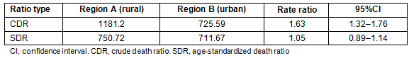 Mortality data for the period 1999-2008 were collected from the death registries of two regions: region A (N=3879 records), which was 92.7% urbanized (National Statistical Authority, 2001 census) and region B (N=2237 records), where 14 out of 15 communities were classified as rural. A population is defined as rural when fewer than 2000 residents are reported in the census. Cases involved male and female individuals with permanent residence in either of the two regions. Cause of death was defined according to the WHO's 10th edition of International Classification of Disease. Age-standardization was performed by the direct method using the WHO Standard European Population24 as reference, according to the equation: