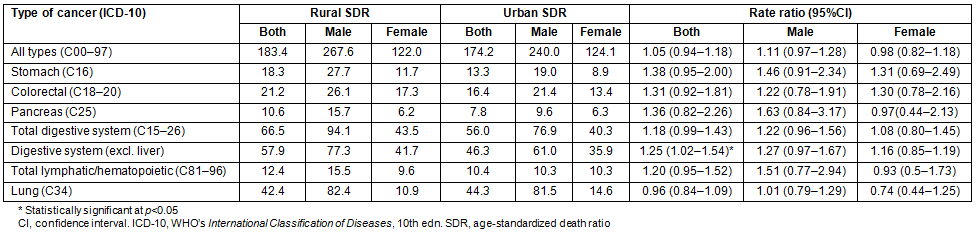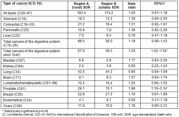 Table 2: Rural-urban disparities in cancer mortality: age-standardized rates and ratios
