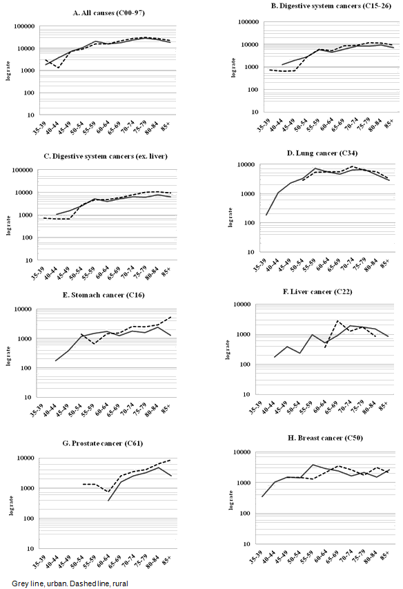 Detailed analysis of age-specific cancer mortality produced some notable results (Fig1). The incidence of stomach cancer in rural areas was significantly elevated in the older age groups (>65 years). In contrast, there were no liver and lung cancer cases in younger cohorts of region A.