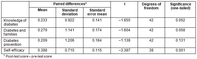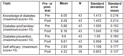 In all, 43 individuals (16 health professionals and 27 volunteers) completed pre- and post-knowledge tests. Thirty-nine of them also completed the efficacy assessment, which included questions about their ability to talk with others about diabetes, lifestyle changes and healthy nutrition. Using a paired samples t-test, the analysis showed the change in perceived efficacy was significant, and knowledge about diabetes and information about diabetes and families approached significance (Table 1). Based on the pre-test scores, the results show that these participants possessed a high degree of knowledge about diabetes and diabetes prevention prior to participation (Table 2).