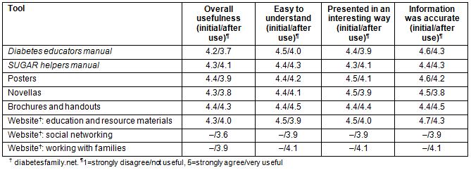 In the first year, 30 health professionals were asked to rate the materials in the toolkit, using a scale of 1-5 (5='strongly agree') between the first and second initial training, after the materials had been reviewed with them. At the end of the project, 31 participants, 20 health professionals and 11 trained community volunteers again rated the tools in the Family Matters Toolkit. Table 3 indicates that most tools were highly rated initially and the ratings decreased slightly after participants had the opportunity to use the tools. Most respondents agreed the tools were useful, easy to understand, presented in an interesting way, and possessed accurate information.