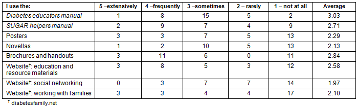 In the final assessment, participants were asked how often they used each tool. As Table 4 indicates, the Diabetes educators manual was most often used, followed by the SUGAR helpers manual. 'Sugar' is the term often used to refer to diabetes in the Appalachian region. Thus, SUGAR (Support to Unite Generations in the Appalachian Region) Helper became the acronym used to refer to participating volunteers. Most materials were put to use in their print form. The website was most often used for education and resources. The website was not substantially employed as a social networking tool or when working directly with families.