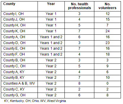 In a 2-year pilot, 11 Appalachian counties, in Ohio, West Virginia, and Kentucky, with diabetes rates among the highest in the nation, were selected to participate. Each county was invited to develop a local coalition of health professionals and designate a local coordinator. Eight Ohio counties were recruited in the first year and seven additional counties from Ohio, West Virginia and Kentucky were recruited in the second year. Using a train-the-trainer model, the investigators conducted 2 days of trainings each year with representative team members from the county coalitions. The trainings covered diabetes topics, prevention, ways to use the materials in the toolkit, and how to recruit and train a group of local volunteers. Those trained were asked to recruit and train a group of community volunteers, incorporate them into the coalitions' work, and develop plans for community engagement. At the end of each year, representatives of the coalitions attended a networking event where they shared their successes, challenges, and plans for the coming year.