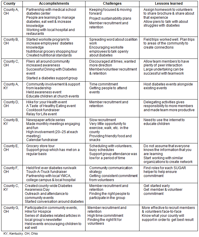 The initial training focused on the crisis of diabetes and the information about diabetes management and prevention. Results showed increases in knowledge and self-efficacy. Feedback from coalition coordinators and key coalition members identified the importance of training and support for the recruitment, engagement, and retention of volunteers. Additionally, opportunities for coalitions to come together, share results of their activities, and exchange ideas with other teams was valuable. This provided insights and inspiration as well as opportunities for support and recognition.