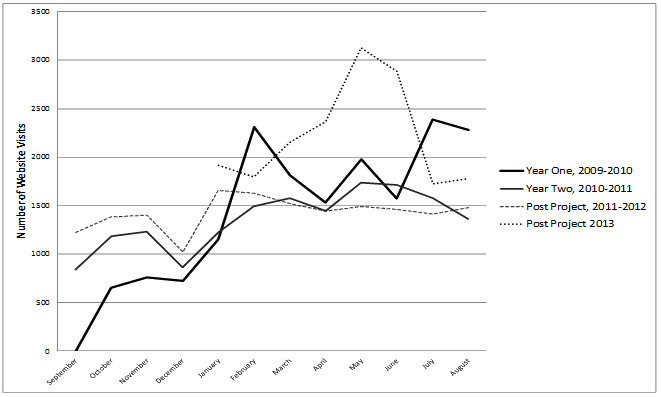 Between the first and second year, the technician managing the website changed, and different website statistics were provided. In the first year, the average number of daily visits were calculated, while in the second year and after the project was completed, monthly statistics on the number of unique visitors was also provided. In all 3 years, the total number of website visits per month was recorded. In the first year, website use nearly doubled between the third and fourth month and then doubled again between the fourth and fifth month. This was when local coalitions were recruiting and training volunteers. The total number of visits then vacillated until July and August when the end-of-year training events were held. Website use decreased somewhat in the first four months of the second year as new coalitions were brought on, but increases appeared again around month five and remained until the end of the project. Data from 2 years post-project demonstrated that website use remained fairly steady even after the project's formal completion, as many of the county coalitions continue their activities and others gain access to the website (Fig1).