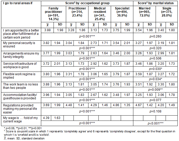 Table 1: Physicians' opinions about working in rural areas according to occupational group and marital status