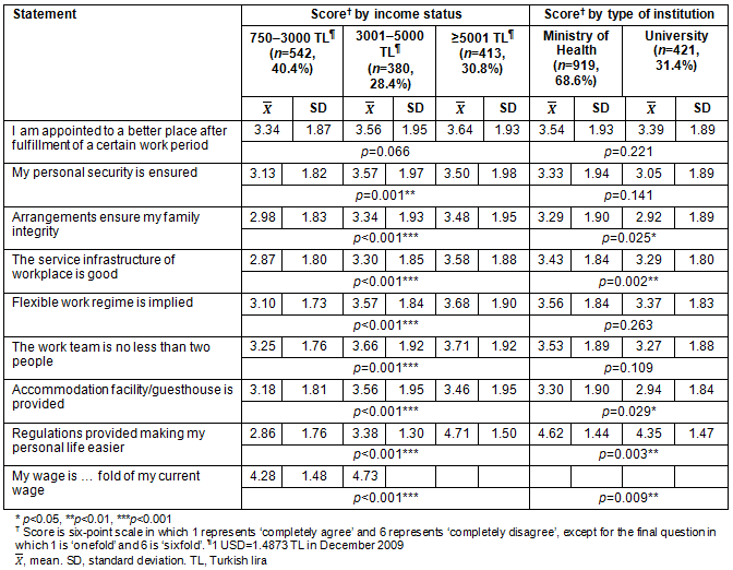 Table 2 presents the ANOVA test results comparing the opinions of physicians about working in rural areas according to their income status as well as the t-test results comparing their opinions according to the type of institution at which they work. All statements except 'if I am appointed to a better place after fulfillment of a certain work period' showed statistically significant differences according to income (p<0.05). The Scheffe test results show that the physicians in the 750-3000 Turkish lira (TL) income group thought differently than did those in the 3001-5000 TL and 5001 TL and above income groups. The physicians in the 750-3000 TL income group expressed more positive opinions about working in rural areas. An increase in physicians' income reduces their willingness to work in rural areas.