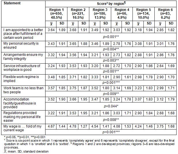 Table 3 illustrates physicians' opinions about working in rural areas according to the region in which they work. The mean scores of all statements about working in rural areas differed significantly according to the region of their workplace (p<0.05). Specifically, physicians working in the developed provinces in regions 1 and 2 were more reluctant to work in rural areas, whereas those working in the less-developed provinces in regions 3-6 were more positive about working in rural areas.