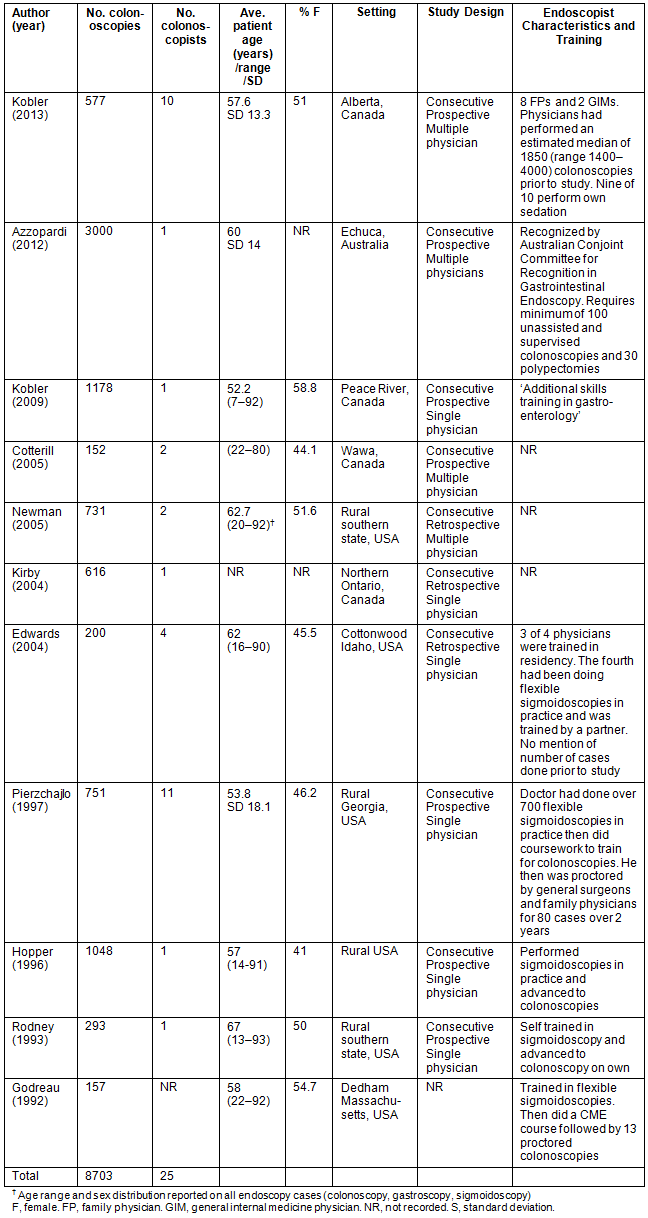 Table 1 summarizes the characteristics of the 11 studies measuring colonoscopy quality by rural practitioners. It includes four reports from Canada, one from Australia and six from the USA. The studies encompass 8703 procedures by 25 colonoscopists. Ten of the 11 studies report on consecutive procedures. Seven collected data prospectively, three were retrospective chart reviews, and one did not report the method of data collection. Five were multi-physician studies. Colonoscopist training is summarized when available.