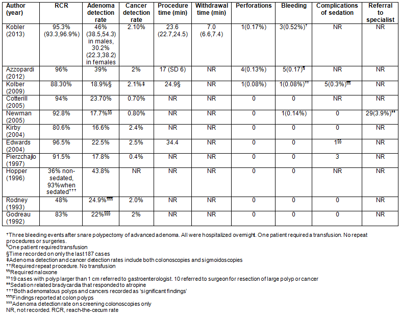 Table 2 displays the results of the 11 studies reporting colonoscopy quality measures. All studies reported RCR, adenomatous polyp detection rates and cancer detection rates. Four studies reported procedure time and one reported on scope withdrawal time. All studies reported complications of perforation and bleeding. Other reported complications included sedation complications and referrals to specialists, but there was considerable variation in how these complications were defined.
