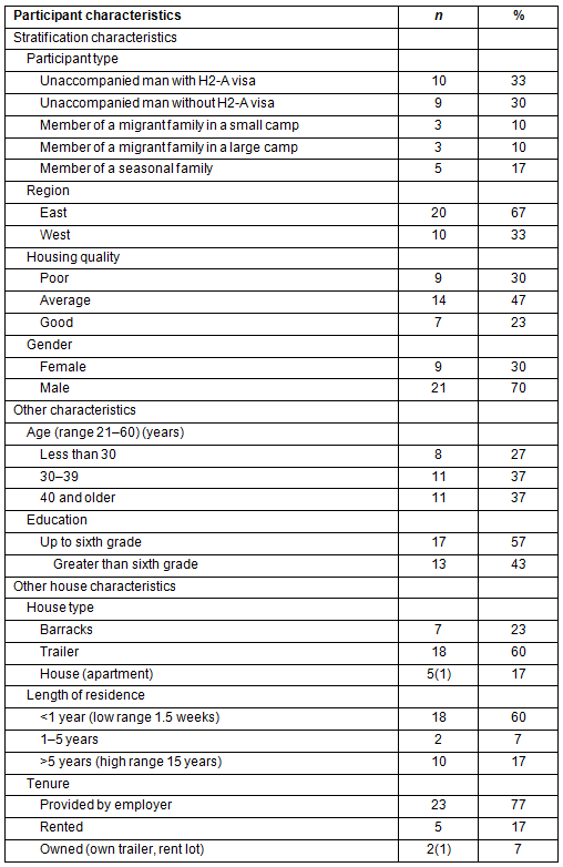 A total of 30 participants were recruited from across North Carolina. Inclusion criteria were being an adult farmworker or an adult partner living with a farmworker, and an ability to speak Spanish or English fluently. Farmworkers with diverse housing situations were purposely recruited so that the full range of housing perceptions and experiences could be elicited. Participants were sought to include unaccompanied men with and without H2-A visas, members of migrant families in small and large camps, and members of seasonal farmworker families. Participants were sought throughout the state. Both male and female farmworkers were included.