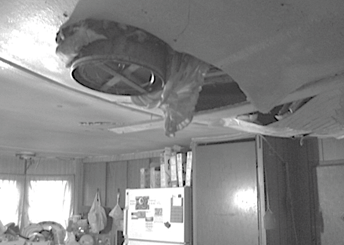 The roof fell in and since then, it's been leaking and that is a problem for us. Yes, it gets wet. For that reason, we put a bucket underneath the leak to collect the water that's falling. Also the house doesn't have air conditioning - only the ones in the windows. So, when it's hot, we suffer from the heat. When it's cold, we suffer from the cold. We only have that heater over there [a space heater]. (ID 13).