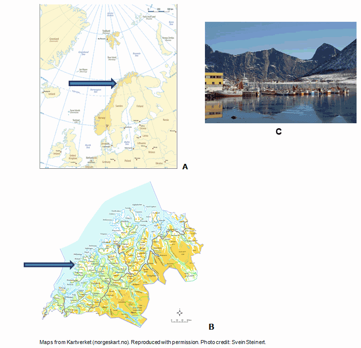 Figure 1: Maps of (A) Norway and neighboring countries and (B) Senja and adjacent mainland. Arrows show location of Senja. (C) The fishing village of Senja.