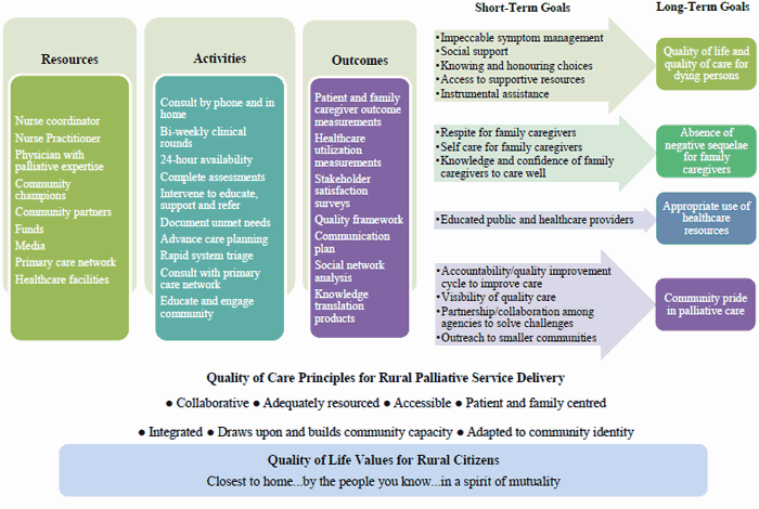 The investigative team worked with the community advisory committee over a 1-year period (2012) to plan RPaSS. Several representatives from the committee worked closely with the investigative team and the committee as a whole met regularly to provide input into the planning. During this planning phase a logic model, assessment framework and communication plan were constructed to support RPaSS. Logic models make explicit the goals that a program seeks to achieve and so can be useful for planning and evaluating practice-based research initiatives52,53. The logic model located in Figure 2 describes the resources, activities, outcomes, and goals RPaSS seeks to achieve. At the bottom of the diagram are listed the foundational values and principles, derived from research, upon which RPaSS is designed. RPaSS has four primary goals: to enhance quality of life and quality of care for dying persons; to attenuate potential negative sequelae, such as depression and burden, for FCGs; to support appropriate use of the healthcare resources available in rural communities; and to promote a sense of community pride in the palliative care provided to citizens. These four primary goals are supported by a variety of short-term goals that are suitable for measurement.