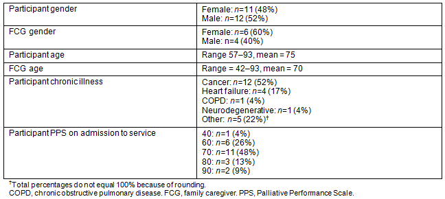 To date, 23 participants and 10 FCGs have been recruited to the service. Table 1 shows the demographic data for these participants. Recruitment increased steadily over the first months of the service, from two participants recruited in the first month to nine participants recruited in the eighth month at which point the nurse coordinator was unable to accommodate further participants. Recruitment was more challenging than originally anticipated. A number of factors may have influenced recruitment: the reluctance of individuals to identify themselves as having a life-limiting illness, the reluctance of physicians to refer to a project that is time-limited, a misunderstanding in the community that the service was already over-subscribed, and the challenges of making the service known in the community. To enhance recruitment efforts, the nurse coordinator visited physician offices, home care services, and hospital-based services to educate them about the service. Recruitment materials were placed on logo pens with flash drives so that healthcare providers had the necessary materials readily available. Flyers were placed at strategic locations throughout the community (eg pharmacies) and advertisements were run in local papers. The nurse coordinator and research team spoke at community forums and research assistants passed out flyers in public places such as grocery stores and churches. Recruitment flyers were modified to indicate 'serious' rather than 'life-limiting' illness. Advisory members played an important role in recruiting participants and designing strategies to enhance recruitment. The most effective strategies were those that entailed personal contact such as consulting with healthcare providers and attending local meetings. Media strategies were costly and less effective.