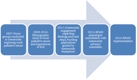Figure 1 provides a timeline of the partnership between the investigative team and community-based champions, illustrating the length of time that can be required to know a community well and to build the credibility required for community-based research methods37. The idea of RPaSS was derived from findings of several studies that explored the state of palliative care in these communities through stakeholder interviews and participant observation18,21,23. In keeping with community-based research methods, the investigative team worked closely with champions from these communities to determine the needs and to develop and implement RPaSS as a response to those needs.