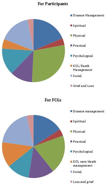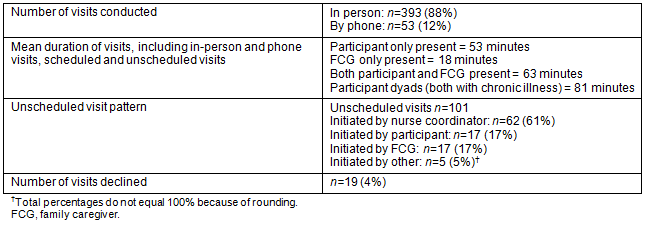 One of the indicators of acceptability of an intervention is the number of declined visits. Over 17 months and 393 in-person visits, there have only been 19 declined visits. Requests for additional visits based upon perceived need are another indicator of acceptability. Of the 101 unscheduled visits completed by the nurse coordinator, 38% were at the request of the participant or FCG. No participants have withdrawn from the study, although one participant did not receive a visit for several months, citing a reluctance to focus on his/her chronic illness. This individual has since resumed visits. Figure 3 illustrates the nature of the needs addressed for participants and FCGs; the most common are related to disease management and the attending physical symptoms. Interventions to meet these needs have been teaching, referral, support, and physical care. In some cases, the nurse coordinator arranges more frequent contact to ensure that identified needs are resolved.