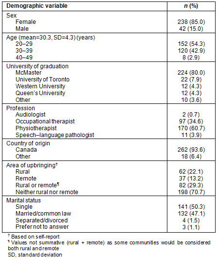 Of the 536 potential participants, 282 individuals responded to the survey; two of these individuals answered only a few demographic questions and discontinued the survey at that time. These two individuals were therefore excluded. Thus 280 survey respondents were included in the data analysis (response rate 52.2%).