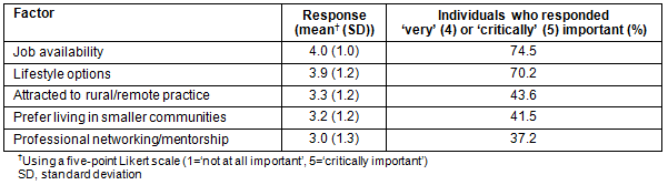 While an attraction to the unique employment inherent in a rural/remote practice area and a preference to live in small communities were both rated more highly by individuals originally from a rural/remote area compared to those individuals who were not, the difference between groups for both of these factors was not statistically significant (data not shown).