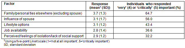 In a subgroup analysis, amongst those individuals who moved to, but subsequently moved away from, a rural/remote area, there were no statistically significant differences in factors impacting this decision between those originally from a rural/remote area and those who were not (data not shown).