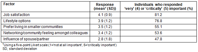 Amongst those who continued to live in a rural/remote area, 'job satisfaction', 'lifestyle options' and 'prefer living in smaller communities' were factors rated highly both by individuals originally from a rural/remote area and those who were not, with no statistically significant differences noted between groups (data not shown).