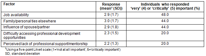 Individuals not originally from a rural/remote area placed greater emphasis than their rural/remote-raised colleagues on professional networking opportunities as an important retention factor. Interestingly, individuals not originally from a rural/remote area cited spousal ties as a moderately important retention factor (mean Likert score 2.1/5.0, SD=0.9, n=36), suggesting that such relationships were formed after moving to the region.