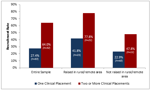 - among those originally from a rural/remote area, 41.8% of individuals who completed only one clinical placement moved to a rural/remote area following graduation; for those originally from a rural/remote area who completed more than one clinical placement, the recruitment rate was 77.8% (χ²(1)=9.4, p=0.002)