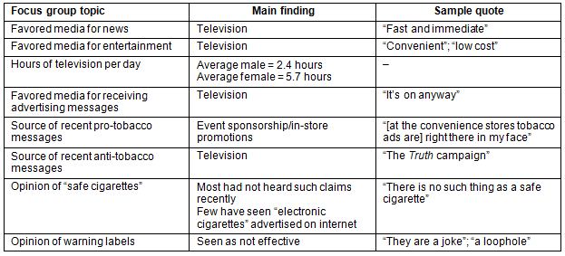 Participants were not assessed with regard to other factors that may have influenced their perceptions of tobacco-related media, such as their readiness or willingness to quit smoking. It is possible that participants in earlier stages of change (eg pre-contemplation) may perceive pro-tobacco messages differently than those in later stages of change. Additionally, environmental and contextual factors were not assessed. Nevertheless, it is believed that this sample offered key insights into exposure to, and perceptions of, tobacco-specific media.