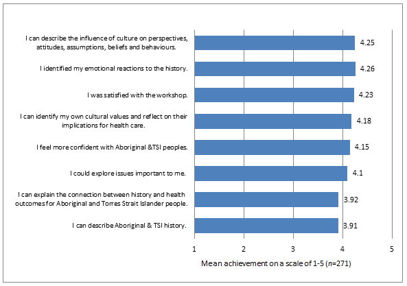 Students generally agreed that the preparatory materials provided them with sufficient information about the workshop and stated that as a result of attending they could describe the influence of culture on perspectives, attitudes, assumptions, beliefs and behaviours. Furthermore, they indicated that they were able to identify their own cultural values and reflect on their implications for health care, and could identify their own emotional reactions to Aboriginal and Torres Strait Islander history. The descriptive statistics indicated that students felt more confident communicating with Aboriginal and Torres Strait Islander peoples and could explain the connection between their history and health outcomes. Fig1 displays the individual mean ranks (range 1-5) of the achievement of the overall objectives.