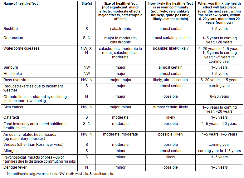 Table 1 describes the health risks identified by participants in the site working individually, as part of step 4 of the workshop asking them to identify 'what might happen in the near or distant future' for their local government region. The results in the table suggest that community members identified perceived catastrophic effects that are 'likely' to 'almost certain' to occur, as well as myriad other health effects with lesser expected impacts, likelihood and immediacy.