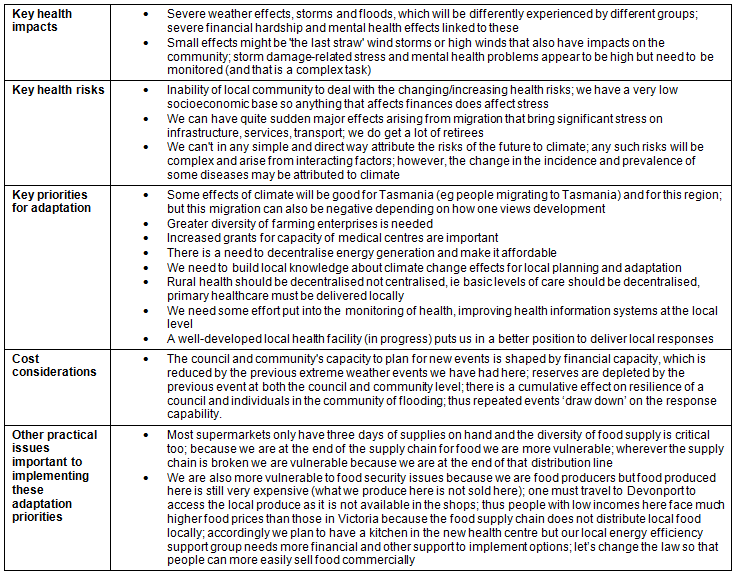 A key theme was managing the socioeconomic multipliers of the effects of climate change. Food security was cited as important, with adaptive capacity shaped by a community's disadvantaged location in the food supply chain, even where that community is a food-producing community. Another theme was declining community volunteerism (leading, for example, to a lack of trained voluntary firefighters) and community participation generally. Statements also referred to declining localism of policy and planning, and its implications for managing nuanced and locally informed rural responses to climate change. They included a concern about the absence of evidence-based supports for decision-making about health adaptation. Above all, responses emphasised the importance of an applied, complexity-oriented understanding of how climate interacts with local services and communities to create health effects. In relation to the CHWRA tool, the northern group in particular stated the need for more modelling of the kinds of information the tool was designed to elicit from local climate witnesses.