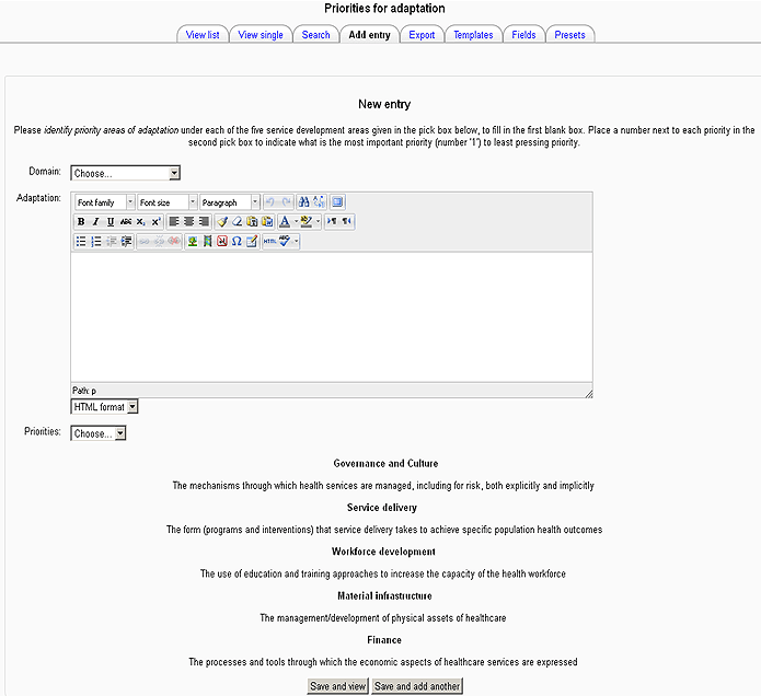 It should be emphasised that the tool continually evolved through the life of the pilot and post-pilot period. Figure 1 is a screenshot of the initial form of the integrative tool used in the pilot, from a section used to obtain data for step 6: participant identification of priorities for adaptation under five domains for health service development.