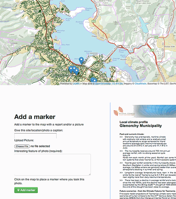 Figure 2 is a screenshot showing one of the functions of the tool available post-pilot. It illustrates what could be described as the interactive 'tagging function' of the tool, which enables stakeholder perceptions and knowledge about services to be incorporated into existing maps (ie maps that were not developed by the researchers and do not presently include that local knowledge). The local knowledge could be some aspect of a health service or some other feature of the local area relevant to understanding a community's infrastructure and adaptive capacity. To the right of the figure can be seen a box including the local area climate change projections or profile. While technically this tagging feature is straightforward, the task of ensuring its ease of use and integration into the flow of the workshop in a manner that optimised data capture from stakeholders, with data discovery and visualisation relevant to health-climate risks, proved to be complex. Ultimately this function aims to capture such features of local services easily added by participants, to map and run time-series data based on climate model projections over the tagged maps, aiding visualisation of likely impacts and risks faced into the future. While data-poor communities present specific challenges, for regions where good-quality health services data are not available at a sufficiently fine detail or granularity, the tagging function can aid incorporation of local knowledge with climate change projections.