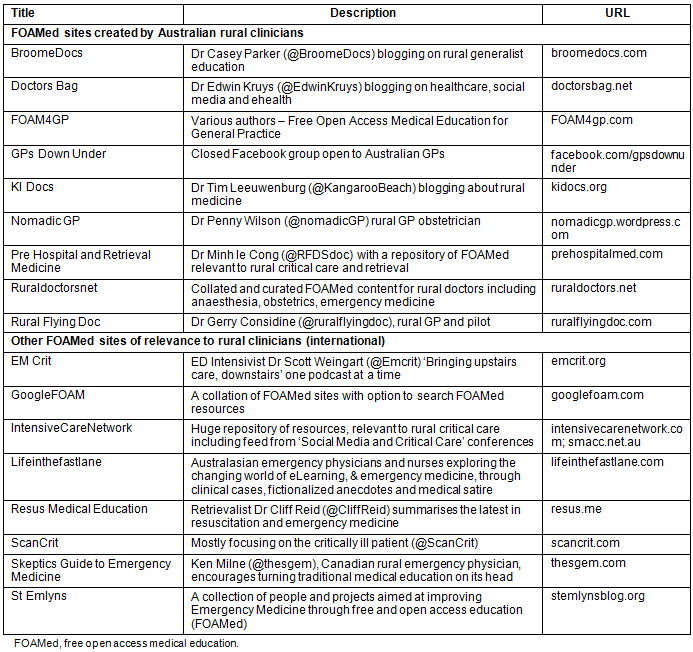 Weingart, one of the leading bloggers for emergency medicine and critical care, has established the paradigm of 'bringing upstairs care, downstairs'6. This is the translation of cutting edge critical care FOAMed into the emergency room. As rural clinicians, we believe in extending the power of FOAMed further- to bring 'quality care, out there' to rural clinicians. One of us (CP) has run an educational blog since 2011, with interactive case studies allowing feedback from clinicians in Australia and overseas. Inspired by this, many other rural clinicians have established blogs that have become a repository for collated and curated FOAMed resources and reflections (Table 1).