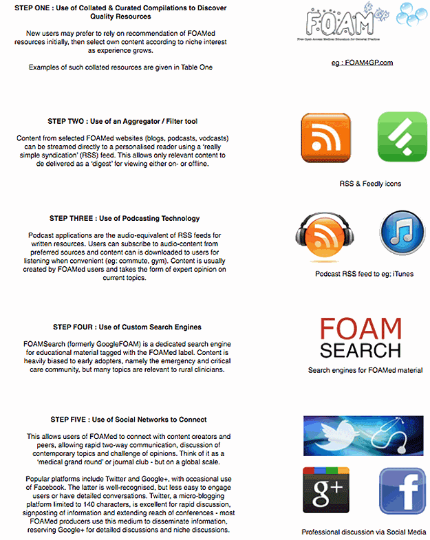 For those exploring FOAMed, visiting a few well-organised and curated sites or podcasts is a sensible way to start. Subscribing to a few well-trusted blogs or podcasts allows highly relevant, peer reviewed and current content to be delivered to your inbox or iTunes library via RSS feeds for browsing at your leisure. An excellent review can be found in a short 400 s 'pecha kucha' talk entitled Dr INFOLove or 'How I learned to stop worrying and love the FOAMed'21. Using effective filters prevents the problem of 'information overload' yet allows the rural clinician to remain up-to-the-minute in knowledge.