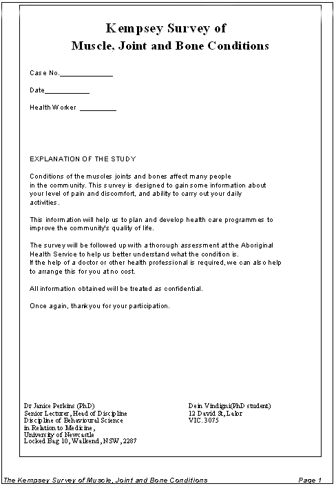 The aim of the key-informant discussion groups was explained verbally and members of the groups were given copies of the developed survey for review and asked to provide general (verbal) and independent (written) comments in relation to: the clarity of questions; cultural sensitivities; the content and presentation of the survey; and the logistics of completing a survey of this kind. The ultimate instrument was titled the Revised Kempsey Survey (RKS).