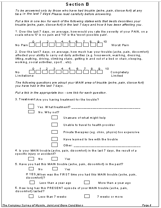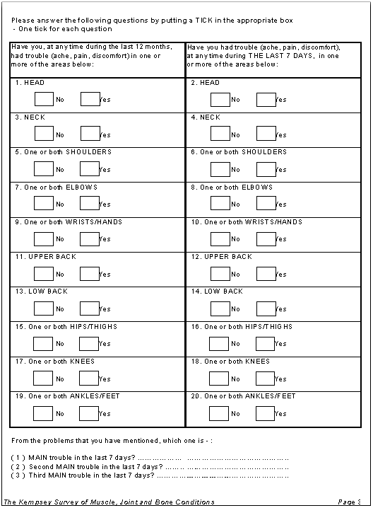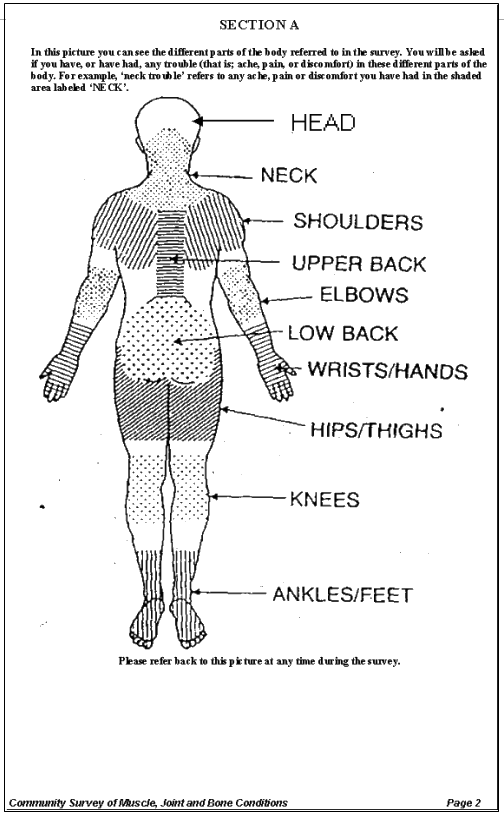 The Survey Section A of the ultimate RKS survey (Appendix 1) consisted of a diagram which delineated the body sites and allowed respondents to comment on any present or past symptoms such as 'aches, pains or discomfort' experienced in the last 7 days and/or the last 12 months. Section B attempted to measure pain and disability 'on average'. A positive pain finding in the survey was noted by AHWs ticking a box that indicated one of the 10 anatomical sites of pain as expressed by participants.