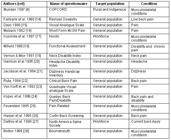 Stage I: Literature search A literature search was conducted to specifically identify potential measurement instruments that could be used as screening surveys and assessments. The primary search strategy included MEDLINE, Pubmed, ABI, Sociofile, Core Biomed, and Nursing Collection for the period January 1980 to July 2000. Only journals written in English were accessed. Key words used in the search included: surveys; prevalence; pain; musculoskeletal conditions; Australian; Indigenous. Bibliographies of papers were examined for other key papers, and direct contact was made with selected researchers in musculoskeletal health.