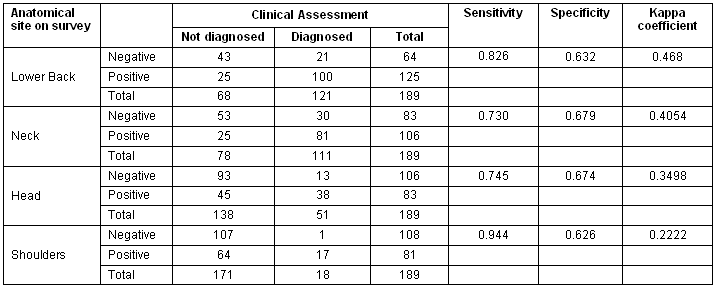 Table 2 shows a comparison of the musculoskeletal prevalence findings of the survey and identifies the conditions independently diagnosed via the clinical assessment components of the study. Sensitivity and specificity of the RKS were assessed at each body site.