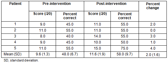There was a 20.8% increase in HF knowledge (Table 1) with the percentage of correct responses increasing from 48.0±6.7% to 58.0±9.7%.