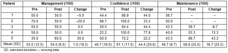 The results of the SCHFI questionnaire are described in Table 2. Despite the intervention and survey completion only taking 60 minutes two participants did not complete the follow-up questions on this survey related to maintenance as they became too fatigued to finish the questionnaire. Of the three participants that did complete this section there was a 26.1% increase in maintenance score (from 46.7±6.7 to 58.9±25.5 possible range 0-100). All five respondents completed the management and confidence questions and there was a 1.9% increase in management (from 53.0±12.5 to 54.0±6.5 possible range 0-100) and a 95.1% increase in confidence (from 46.7±16.0 to 91.1±11.5 possible range 0-100).