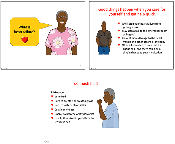 Comprehension was also a theme that emerged to be of importance to stakeholders. Reviewers considered it important that illustrations be created to portray an action; for example, additional fluid accumulation in the abdominal region was illustrated by a man having difficulty doing up his belt. Images complemented text and provided another aid to dependence upon reading ability, and text was converted into plain language. Researchers also changed the tense of language; in most instances first person was used so as to closely identify with the person reading it. For example, in a questionnaire, the original wording 'A primary cause for symptoms of heart failure is too much fluid' was changed to 'Too much fluid in my body causes heart failure'. Acronyms were removed and complex nouns and verbs were replaced with simple descriptive language. Simplifying language therefore occurred in this manner within the PowerPoint slides and questionnaires, and illustrations were developed to aid comprehension.
