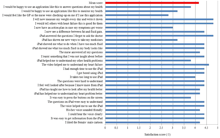 Participant satisfaction was 83.0% (Fig2). Greatest satisfaction was with the inbuilt video demonstration and in having questions answered. All participants indicated a willingness to adopt lifestyle changes (daily weighing) and endorse its use to educate others with HF.
